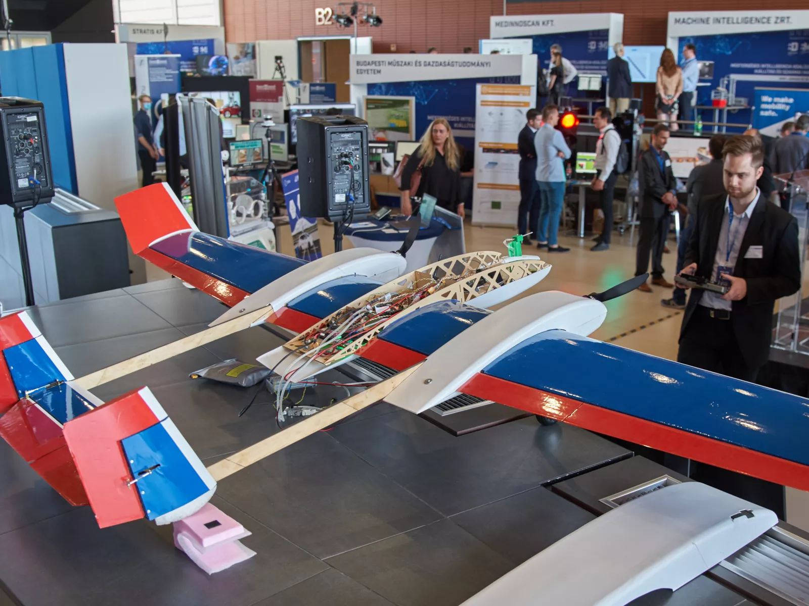 Bemutatásra került továbbá a SZTAKI Rendszer és Irányításelméleti Kutatólaboratóriumában fejlesztett, redundáns kialakítású pilóta-nélküli repülőgép is. Ez a repülőgép egyrészt egy, az EU kutatásban használt repülőgép-fedélzeti rendszer teszt platformja, másrészt nagy terhelhetősége folytán kiválóan alkalmas kamerák hordozására, és így a mesterséges intelligencián alapuló (AI) módszerek fedélzeti kipróbálására, például a ”látni és elkerülni” feladatokban. Az említett EU projektben cél az üzemanyag-fogyasztás csökkentése, ill. a teherhordó képessége növelése különösen karcsú, rugalmas szárnyak alkalmazásával. A szűk kiállítási tér miatt valós repülés nem volt lehetséges, ezért a robotpilóta útvonalpont-követési képességei kerültek bemutatásra: hardware-in-the-loop szimulációban, vagyis a fedélzeti hardver a repülőgép szimulált modelljét vezette valós időben.