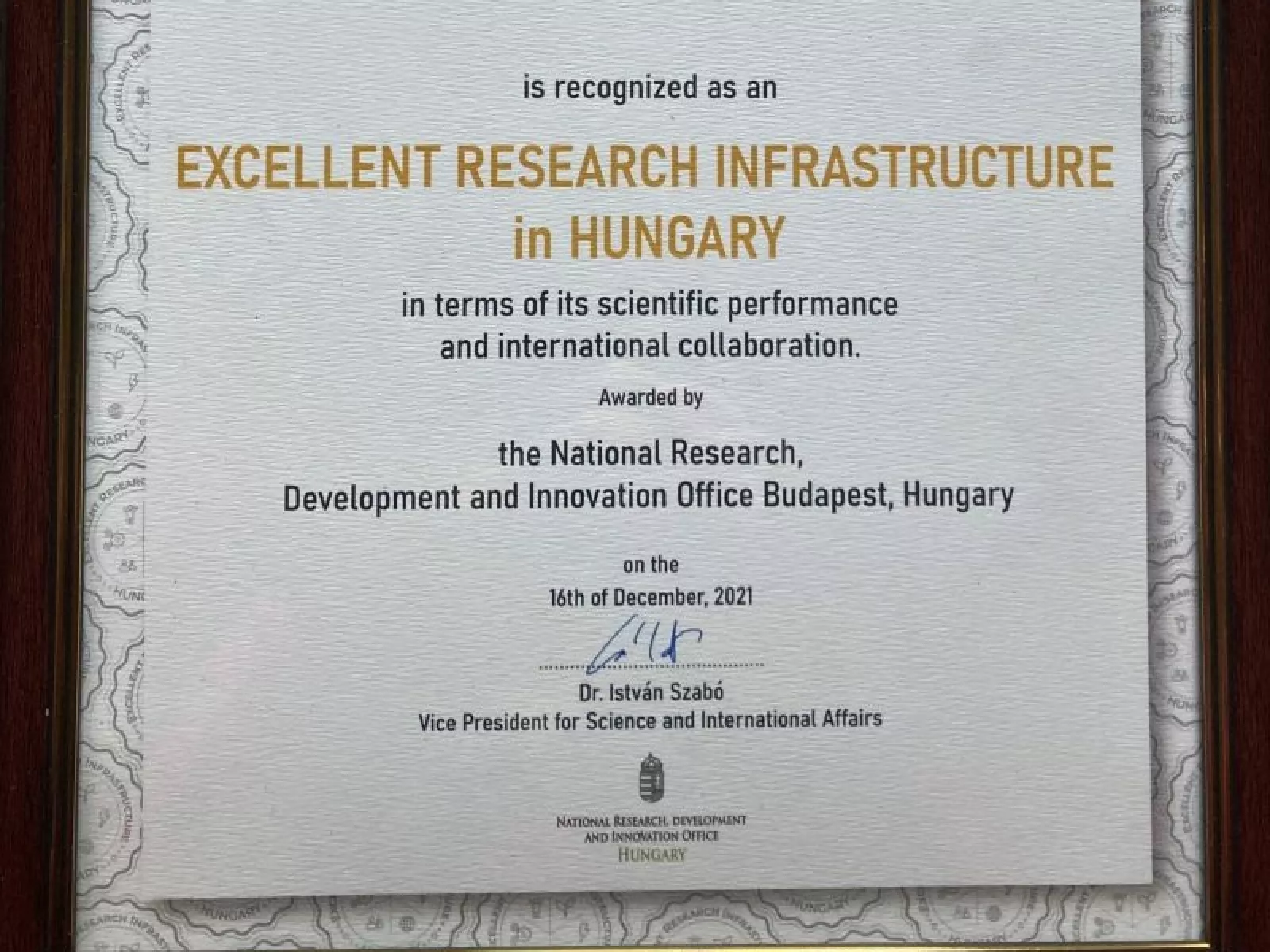 Az elismerő okleveleket Dr. Palkovics László innovációs és technológiai miniszter, Dr. Szabó István, a Nemzeti Kutatás-fejlesztési és Innovációs Hivatal (NKFIH) alelnöke, és Dr. Fülöp Zsolt, a Nemzeti Kutatási és Infrastruktúra Bizottság elnöke közösen adta át 2021. december 16-án, a Pécsi Tudományegyetemen.
