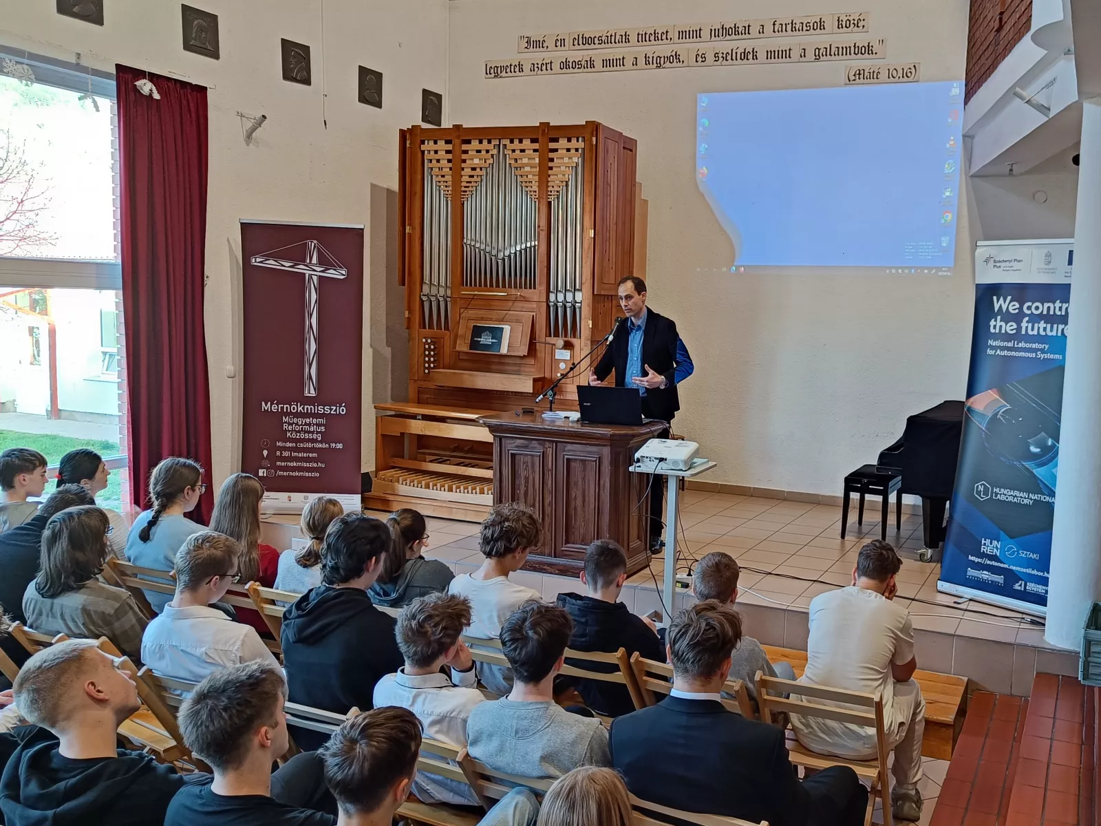 A HUN-REN SZTAKI Rendszer és Irányításelméleti Kutatólaboratórium munkatársai, Németh Balázs, az ARNL vezető kutatója, valamint Budai Csanád és Széles Tamás, az ARNL kutatói “Mesterséges intelligencia és autonóm járművek” témában tartottak előadásokat a Pécsi Református Kollégium Gimnáziumában 2025. 04. 16-án.