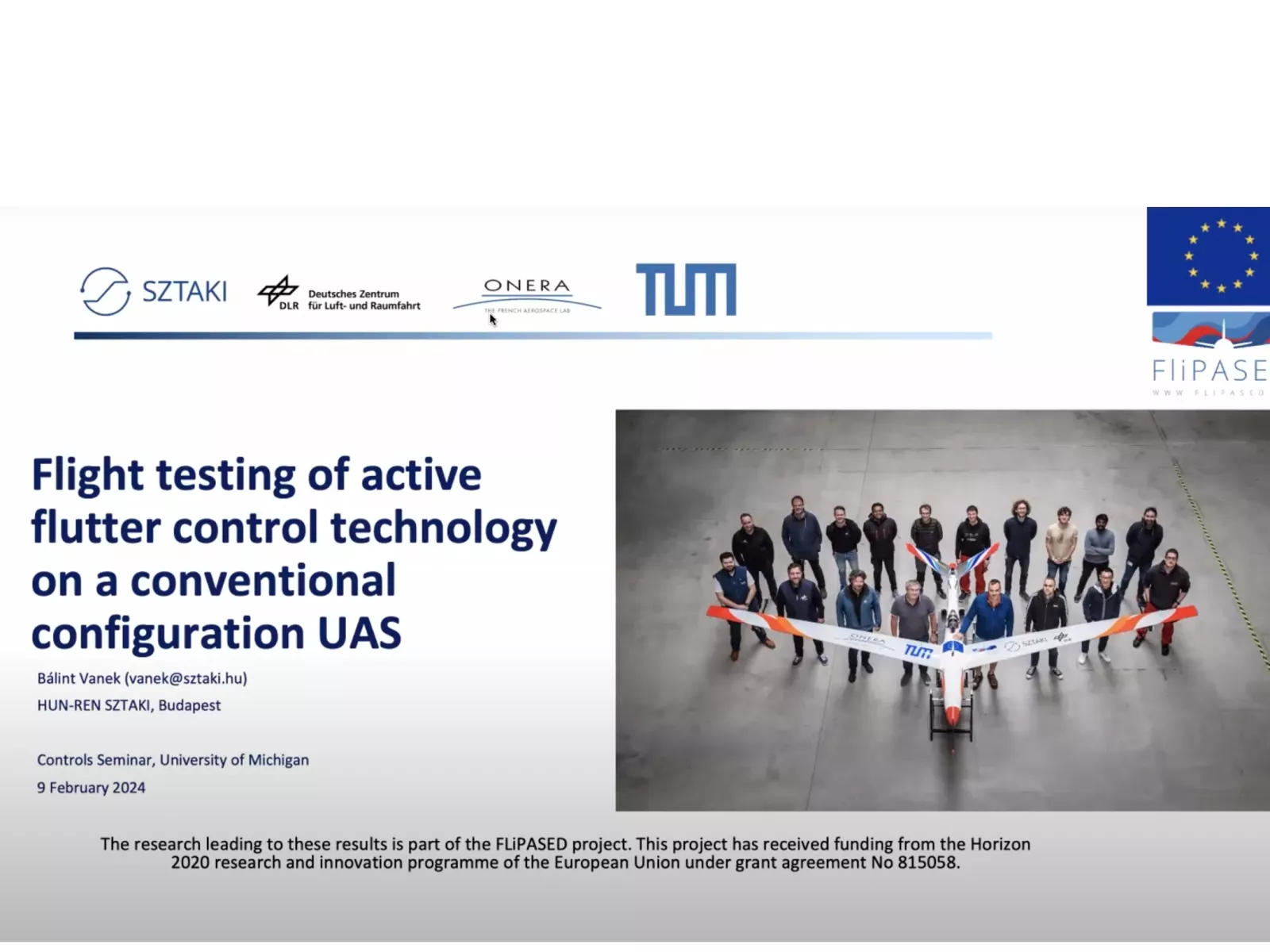Bálint Vanek, lead researcher at the National Laboratory for Autonomous Systems (ARNL) and Deputy Director of HUN-REN SZTAKI, gave a presentation at the Control Seminar organised by the Electrical & Computer Engineering Department of the University of Michigan on the active testing of technologies to mitigate the flutter phenomenon. He also held discussions with several researchers from the University of Michigan.